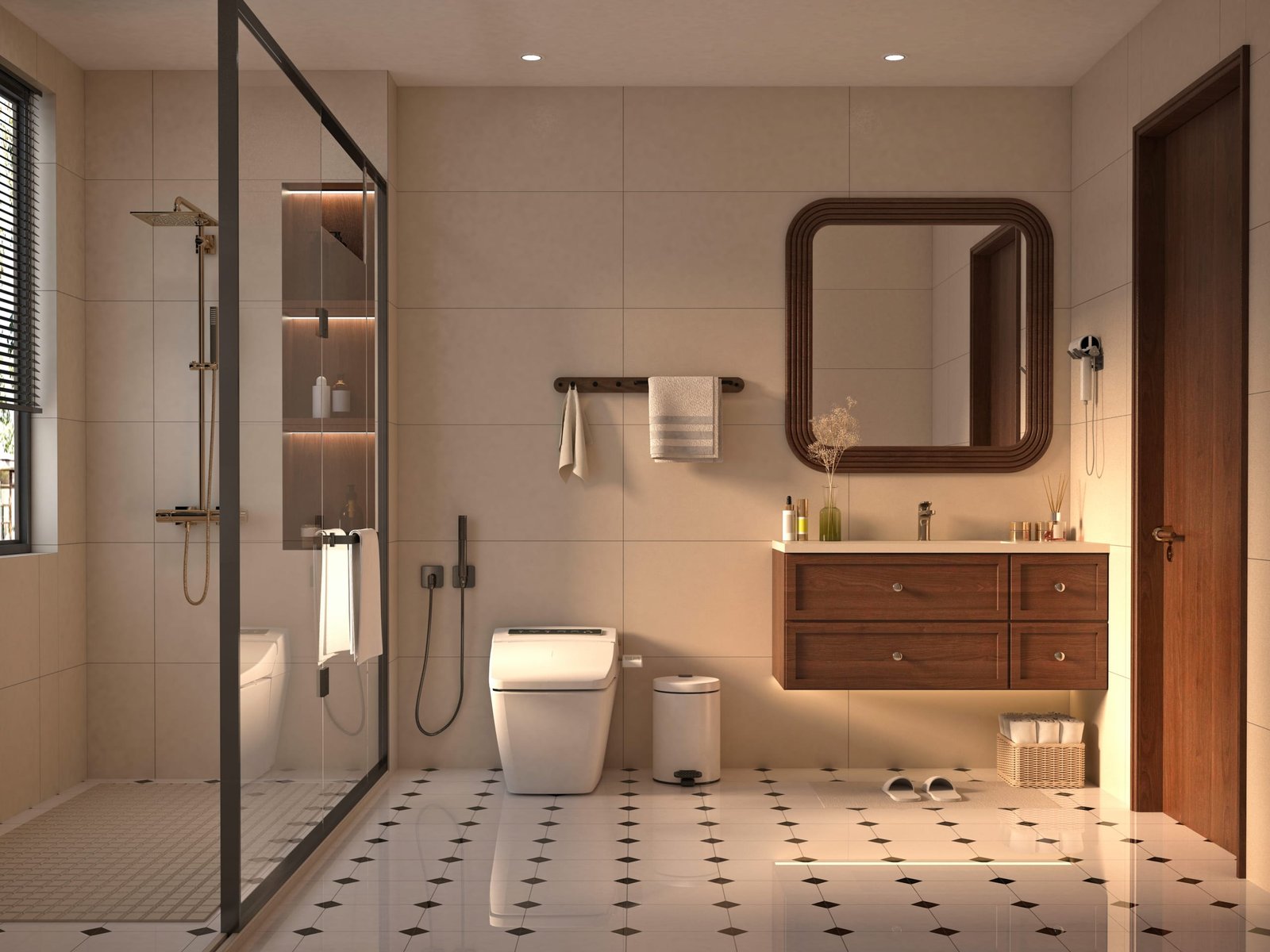 Salle de bain moderne et élégante avec douche à l'italienne, miroir et mobilier en bois.